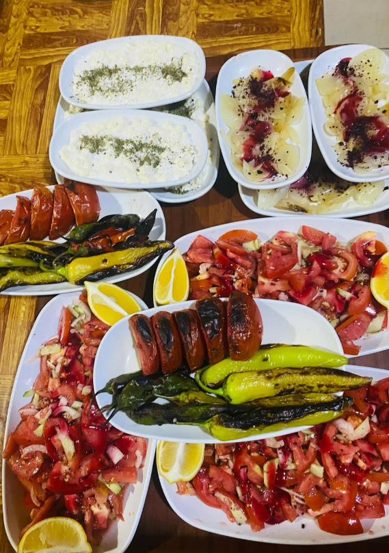 buraya gelenler özellikle sıcak sıcak hazırladığımız kaşarlı alabalığı yada ızgarada yaptığımız et türlerini çok seviyo diyo ki hüsso şu porsiyonlar hep bol geliyor ben de gülüyorum çünkü az koymaya elim varmı hiç ayrıca bahçedeki mis gibi hava iştah açınca herkes daha çok istiyo zaten sabahları serpme kahvaltıyı görenlerin çoğu şaşırıp foto çekiyo