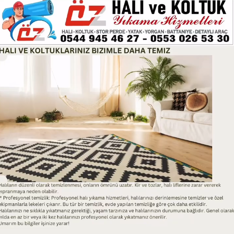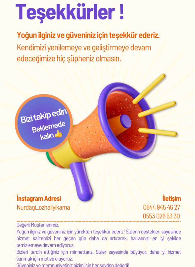 Ben bu isi para kazanmak icin degil once guven icin yapiyom halilar tertemiz cikmadan icim rahat etmez bazen gece gec saate kadar bekledigim olur ama olsun musteri memnuniyeti dedigin boyle bisey iste temiz halı temiz koltuk icin burdayim kapim acik her zaman